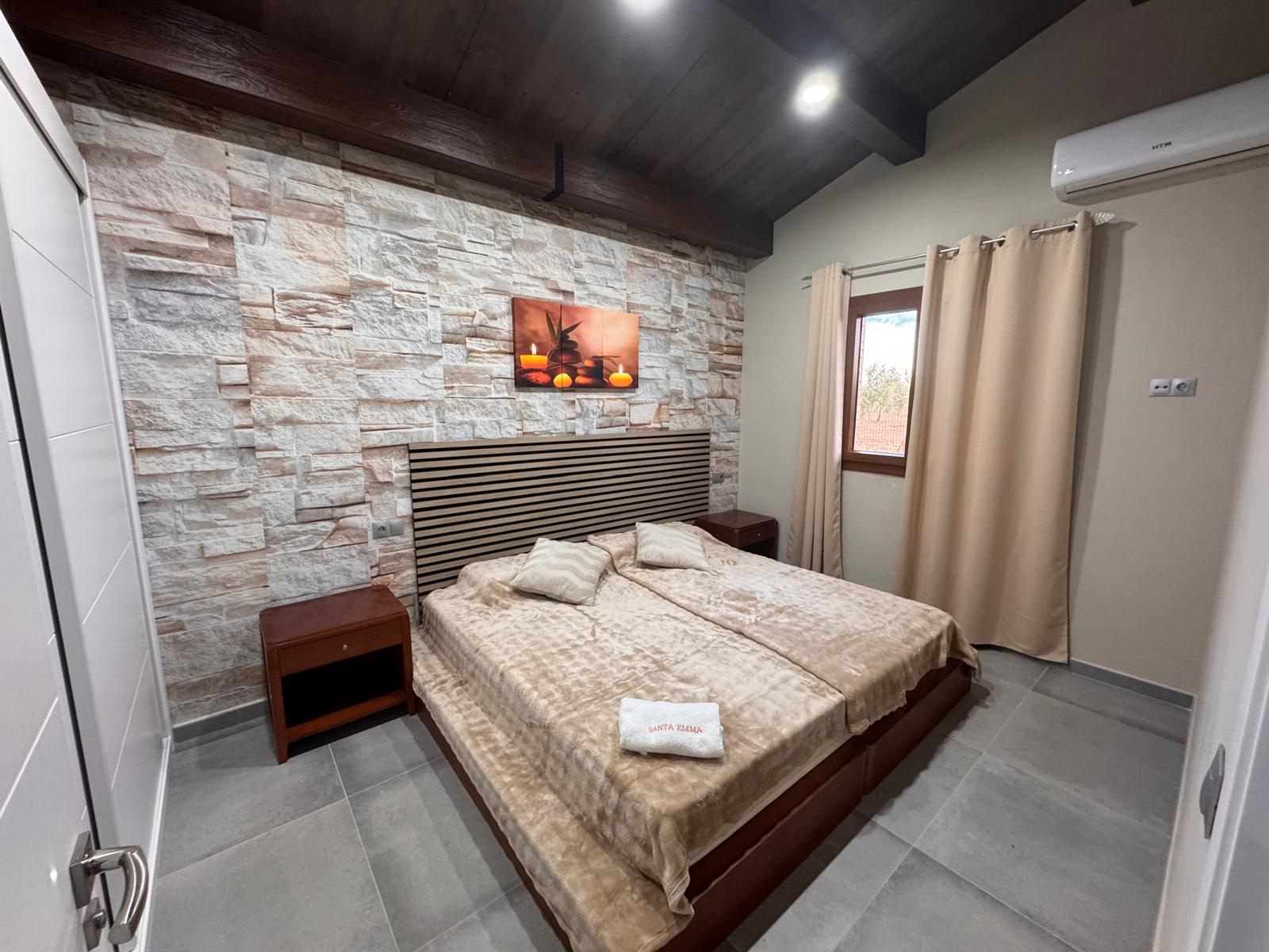 Este alojamiento dentro del complejo Santa Emma está diseñado para ofrecerte una experiencia única de descanso en plena naturaleza. Cuenta con dos habitaciones, un baño completo, cocina americana integrada en el salón, aire acondicionado frio y calor, wifi, barbacoa exterior, toallas, sábanas y aparcamiento privado.